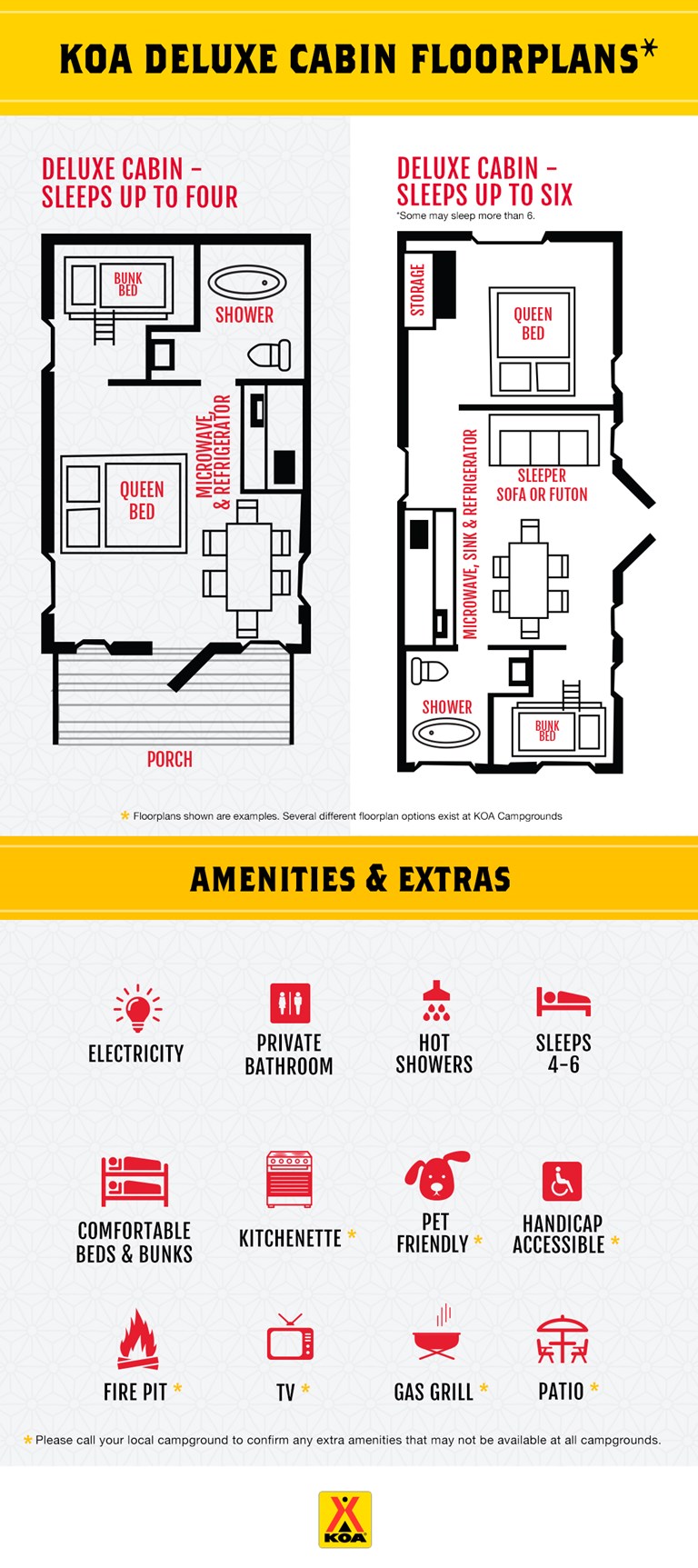 *Please call your local campground to confirm any extra amenities that may not be available at all campgrounds. Cabin floor plans differ.