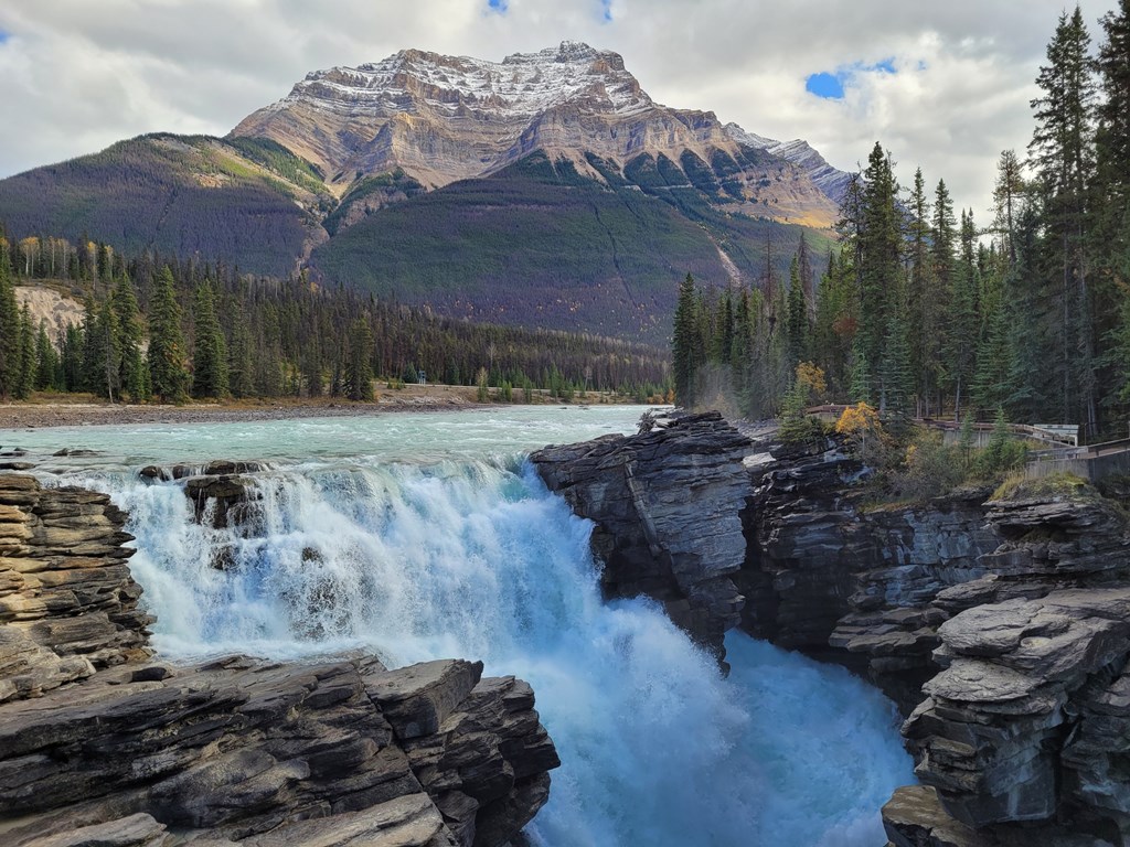 The falls are easily accessible via a short walk from the parking area, with multiple viewing platforms offering different perspectives of the cascading water and the dramatic rock formations it has carved. The surrounding hiking trails provide opportunities to explore the Athabasca River valley and spot local wildlife.